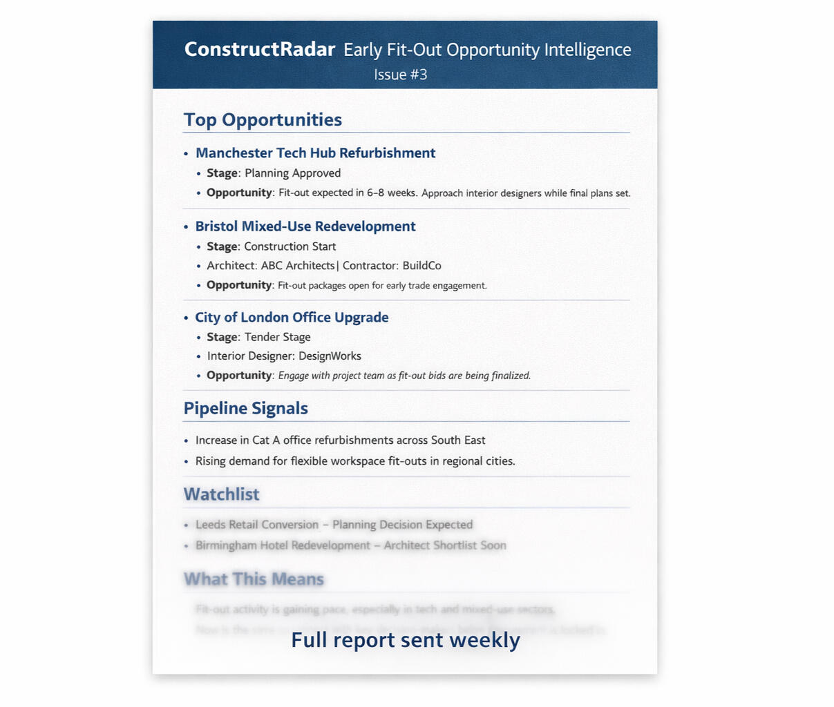 ContructRadar is an AI-curated weekly report tracking upcoming fit-out, refurbishment and interior opportunities across the UK - including named project teams, early-stage signals and recommended actions.